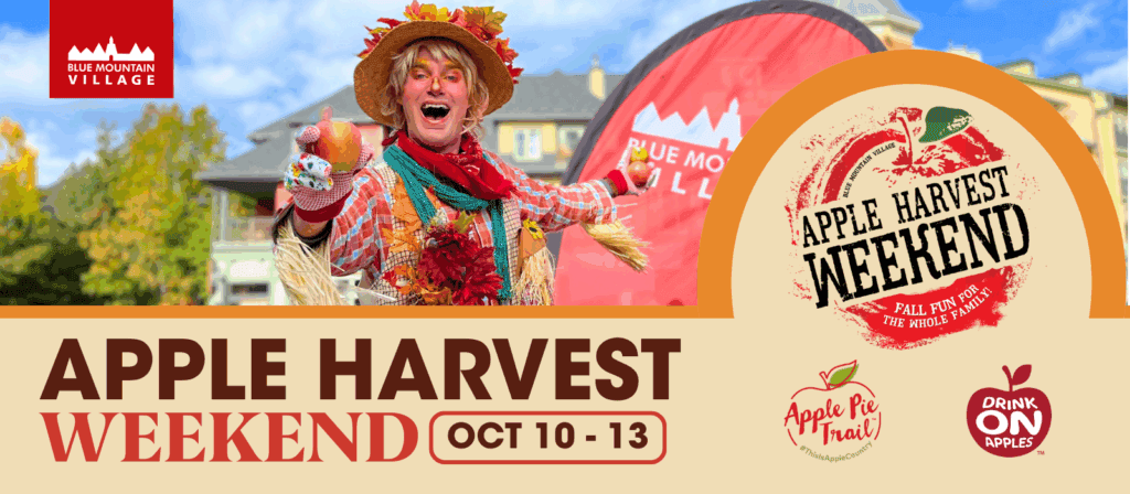 During the Thanksgiving long weekend, Blue Mountain Village celebrates its Apple Harvest Festival with a full slate of activities: cider sampling (DrinkON Apples), touch-a-truck and tractor play stations, stilt walkers roaming the village, barnyard fun for families, live music performances across multiple days, and evening headliner concerts. More info here.